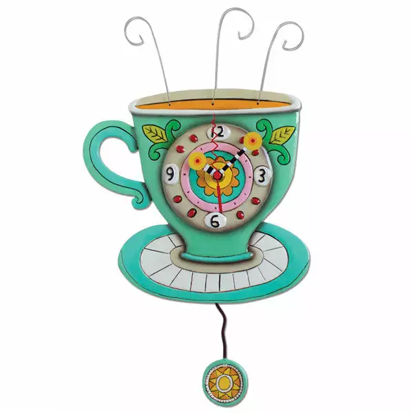 An amusing turquoise tea cup and saucer clock with a swinging sun pendulum. A whimsical graphic art piece for your wall. Makes a cheerful and unique gift.