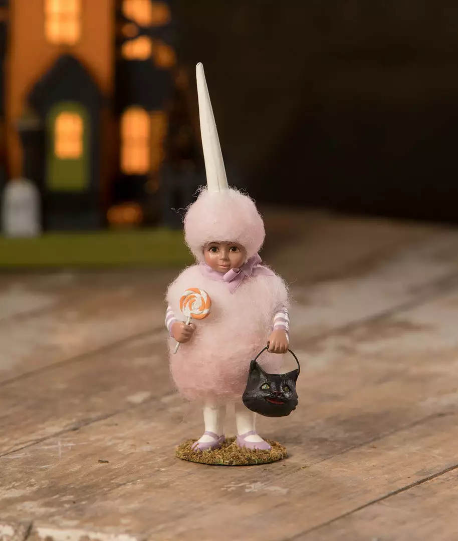 Create a cute trick-or-treating Halloween scene with Cotton Candy Molly. She’s all dressed up in a pink sugar spun cotton candy costume carrying a kitty cat bucket and a big lollipop.