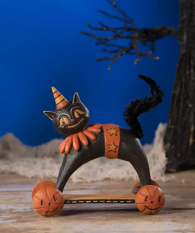 Create an entertaining Halloween scene with this whimsical black cat Halloween pull toy figurine.