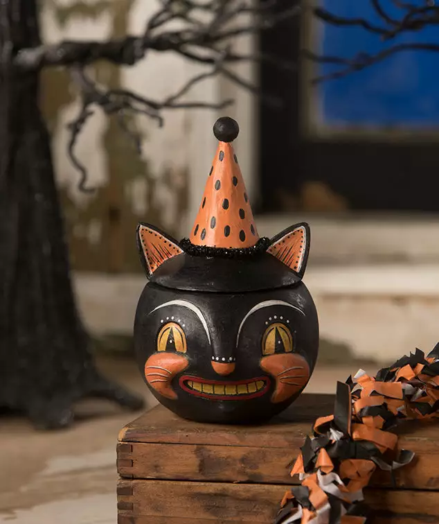 Kick off Halloween with Grinning Vinny Cat Container designed by artist Johanna Parker.