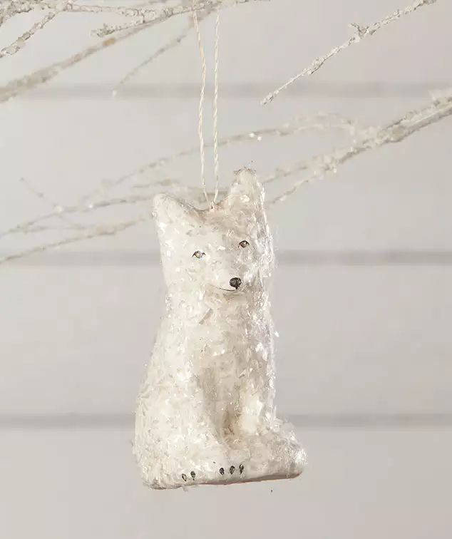 Bring the serenity of nature in with this paper mache Arctic Fox ornament embellished with mica.