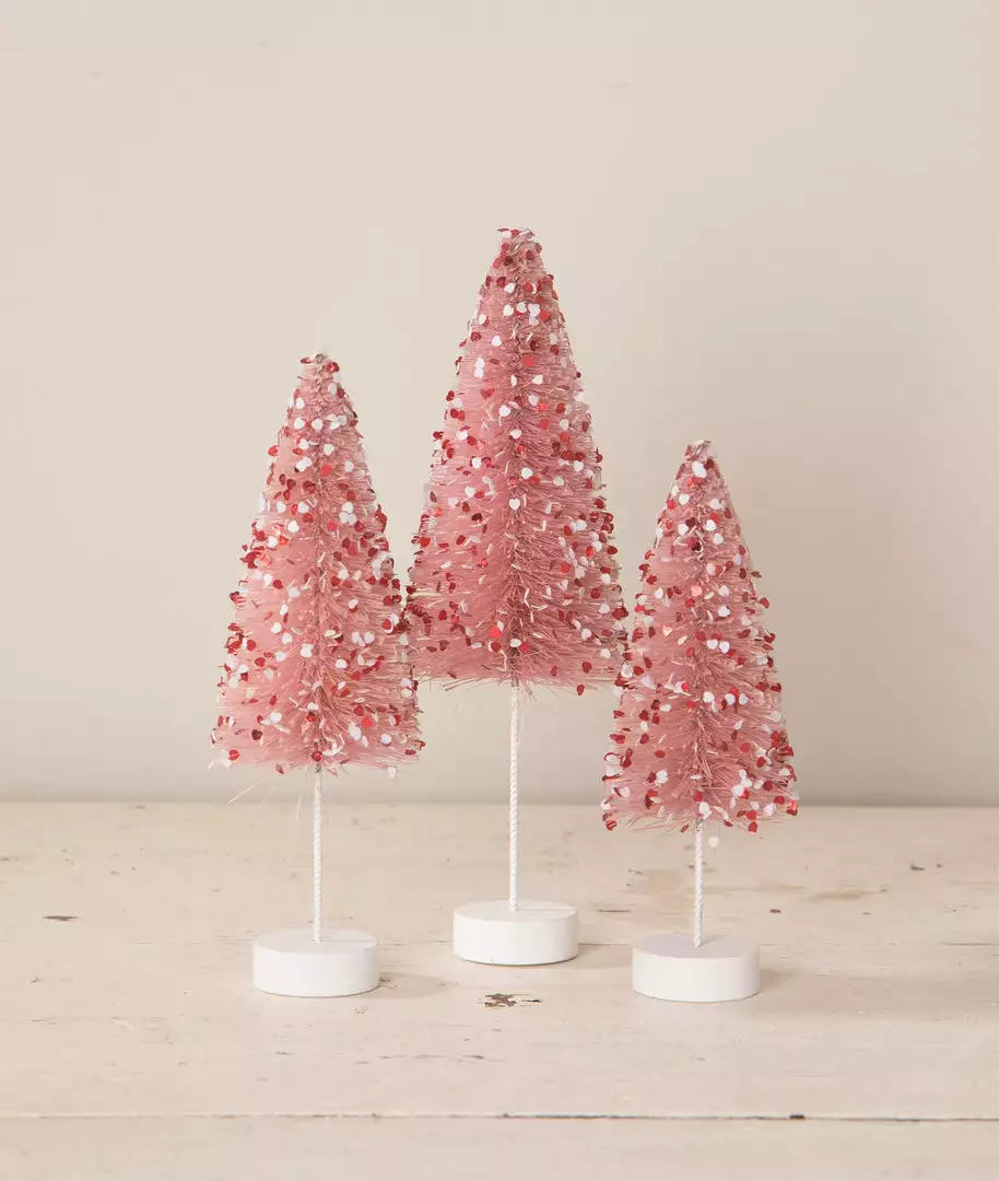 Show the love this Valentine’s day with these playful pink bottle brush trees sprinkled with red and white heart-shaped confetti.