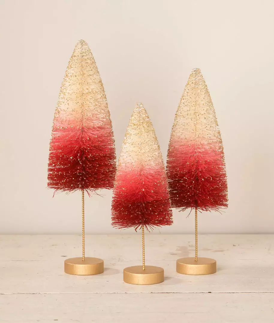 Give your Valentine’s Day decorating a designer look with these on-trend red, pink, and cream ombre bottle brush trees sprinkled with gold glitter.