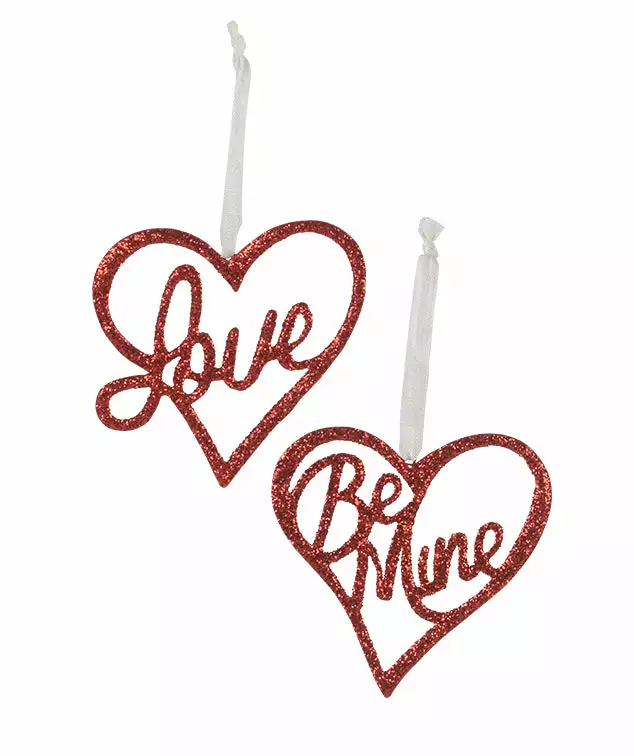 Celebrate Love this Valentine’s Day with these glittered heart-shaped love and be mine ornaments.