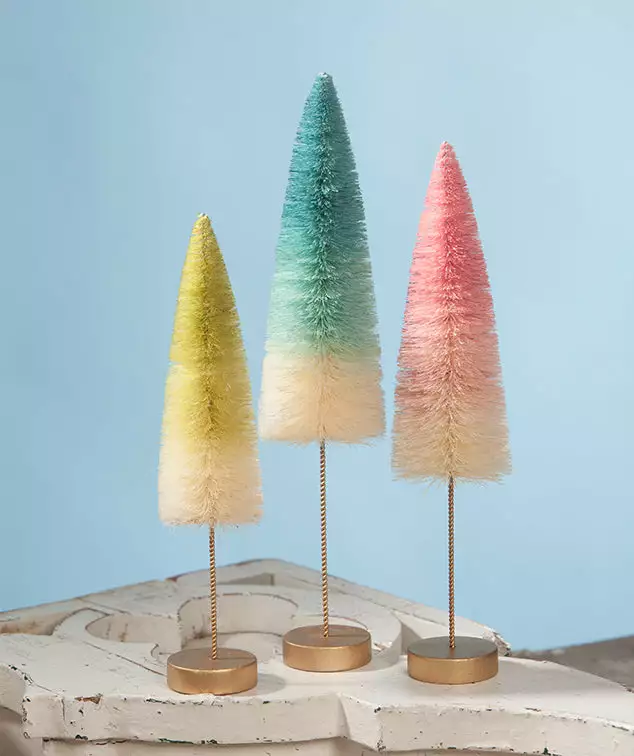 Give your decorating soft pastel color with a chic twist with these Ombre Bottle brush trees in shades of green, blue and pink.