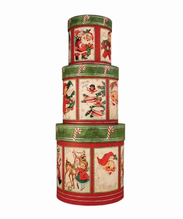 Get in the spirit of Christmas with these fun Retro Christmas Nesting boxes with vintage illustrated Christmas images.