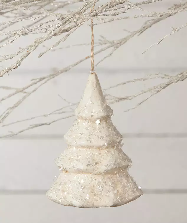 Dream up a merry little Christmas with this festive paper mache and mica Snowy Christmas Tree Ornament.