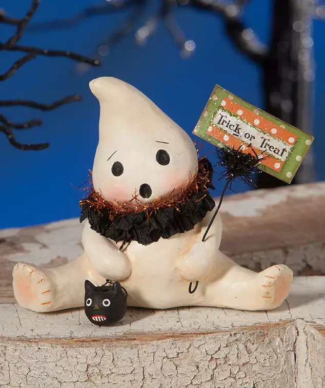 Want to create a happy haunt this Halloween? This roly-poly Trick or Treat Ghostie will add a playful scare to a shelf, table or desk. Ghostie holds his black cat candy bucket and Trick or Treat sign, ready to make your Halloween shine.