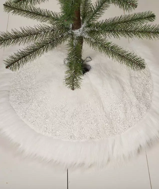 Dream up a winter wonderland with this small faux fur, glitter and bead Winter Snowflake Tree Skirt