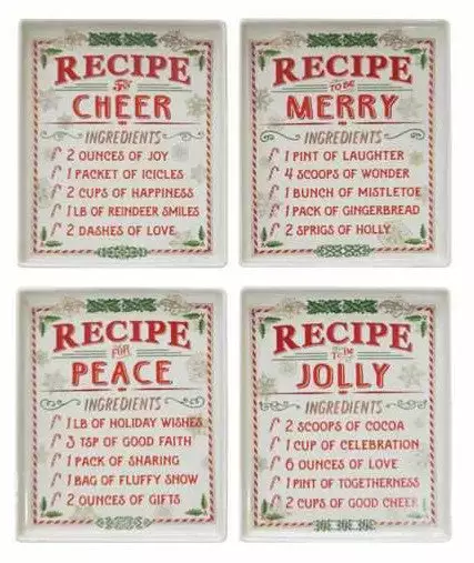 Serve up the recipes for Christmas cheer, merry, peace, and jolly to your table with this whimsical set of stoneware plates.