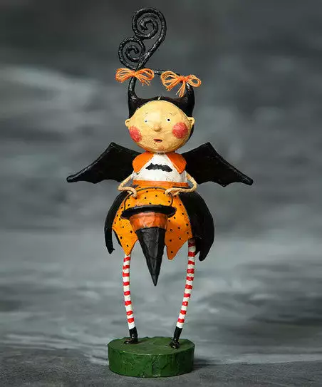 Esperilla is a funky girl in her orange polka dot dress with bat wings, witch’s hat treat bucket and super hip witch socks. A girl that can shop till she drops.