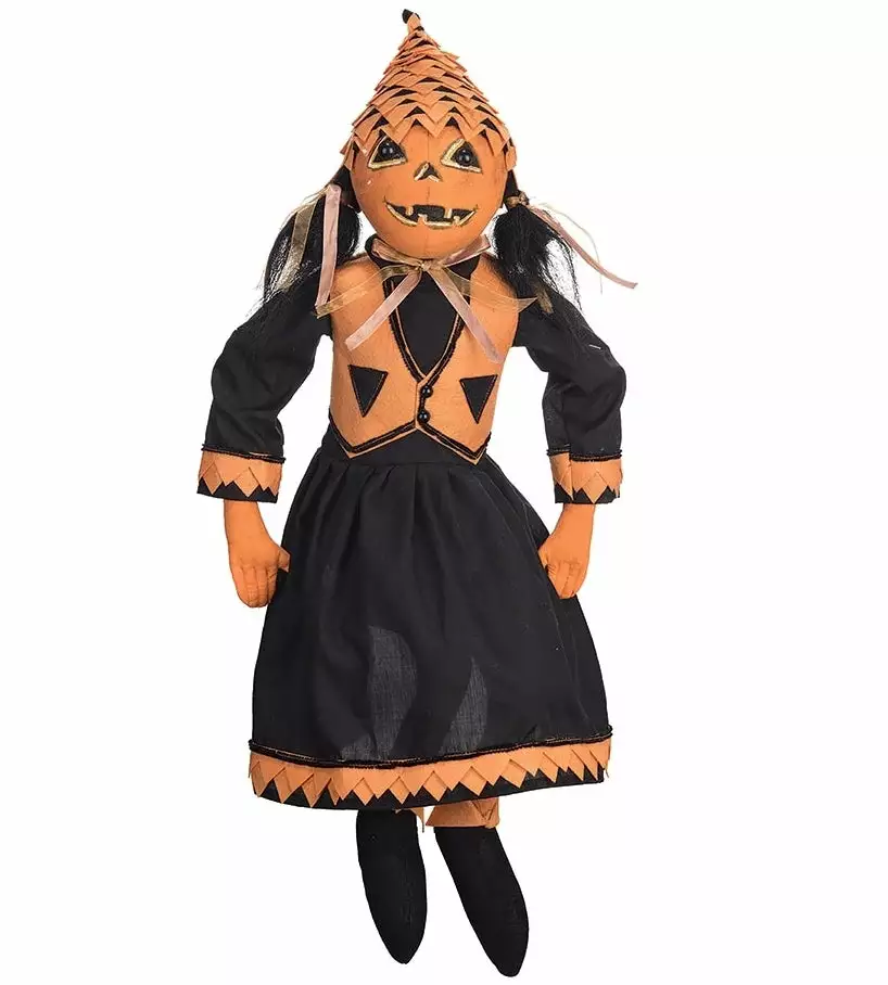 Paige Pumpkin is a retro pumpkin girl with button eyes. She’s wearing a layered felt hat and has a warm, jack-o-lantern smile.