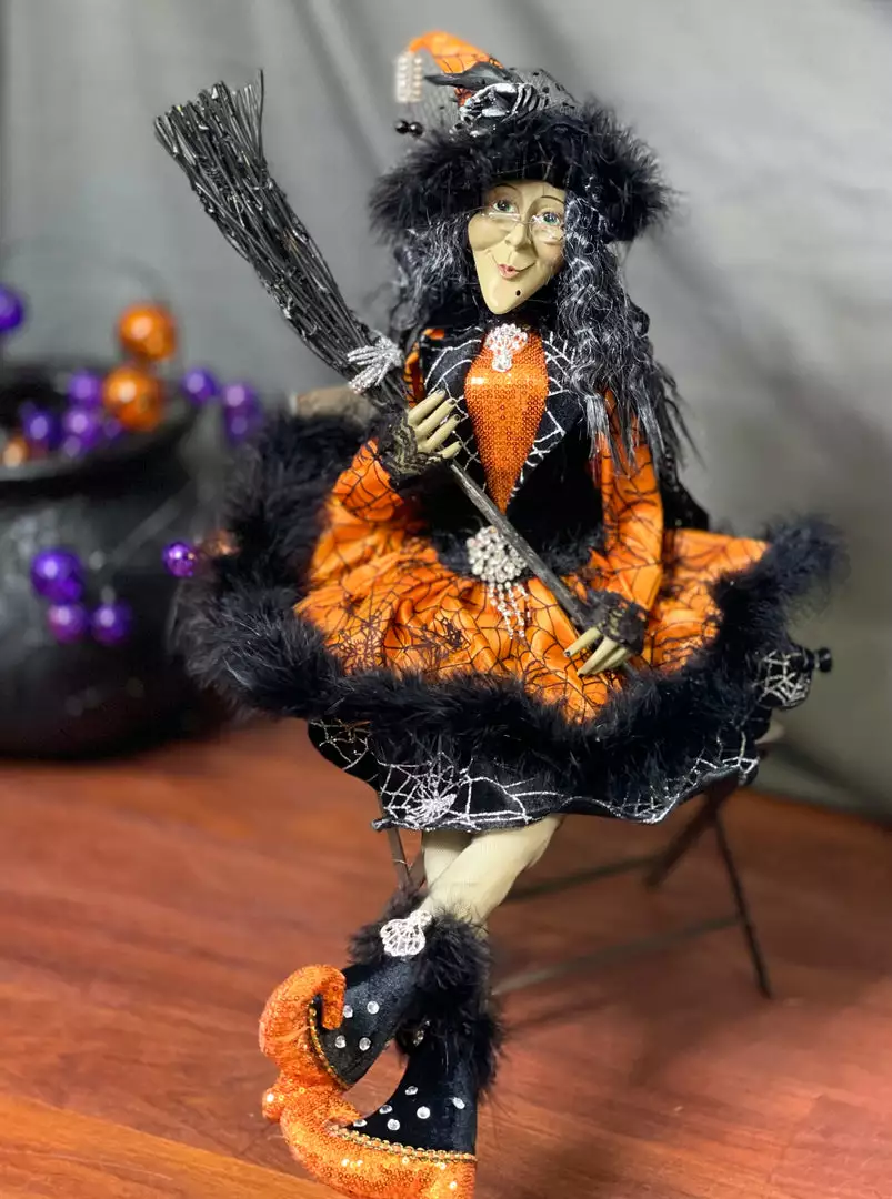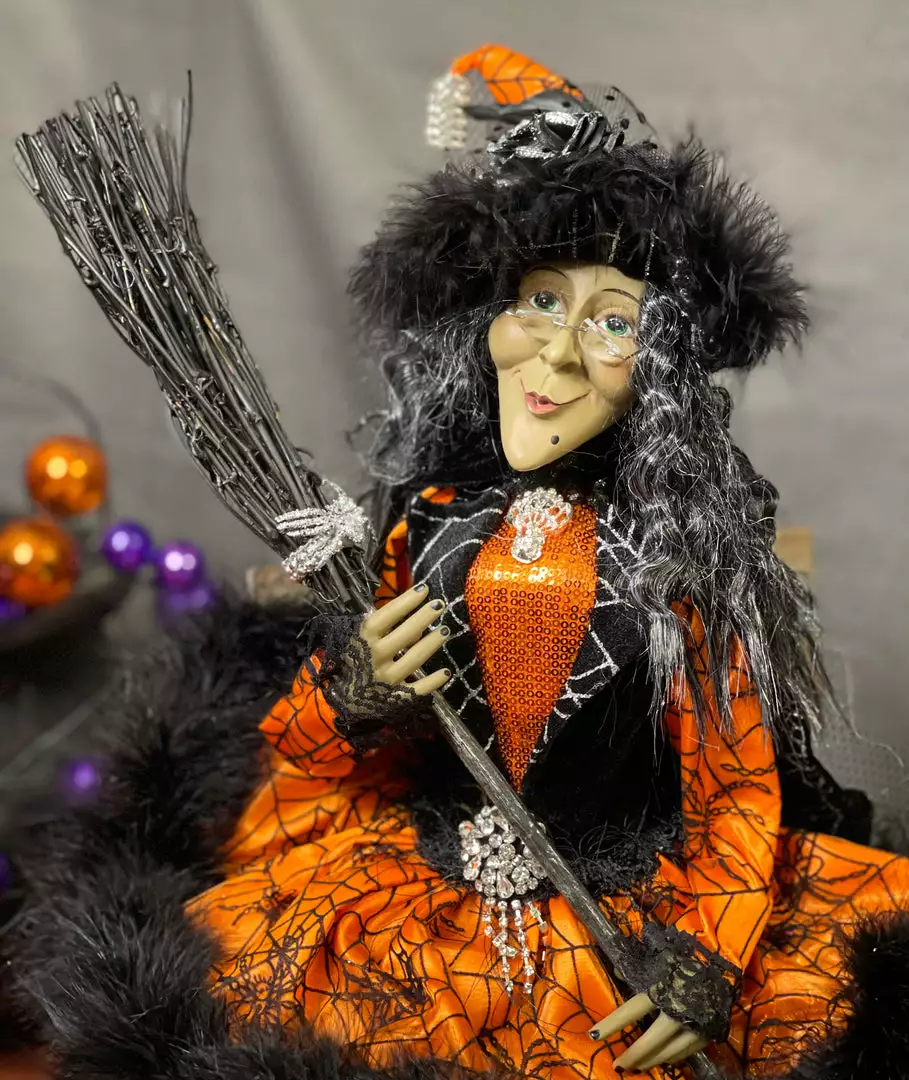 Friendly and fabulous this hip witch has got it going on. Dressed to the hilt in a spicy orange spiderweb dress, feathery trim, and faux jewels. Make your Halloween decorating fabulous with this Pretty Witch.