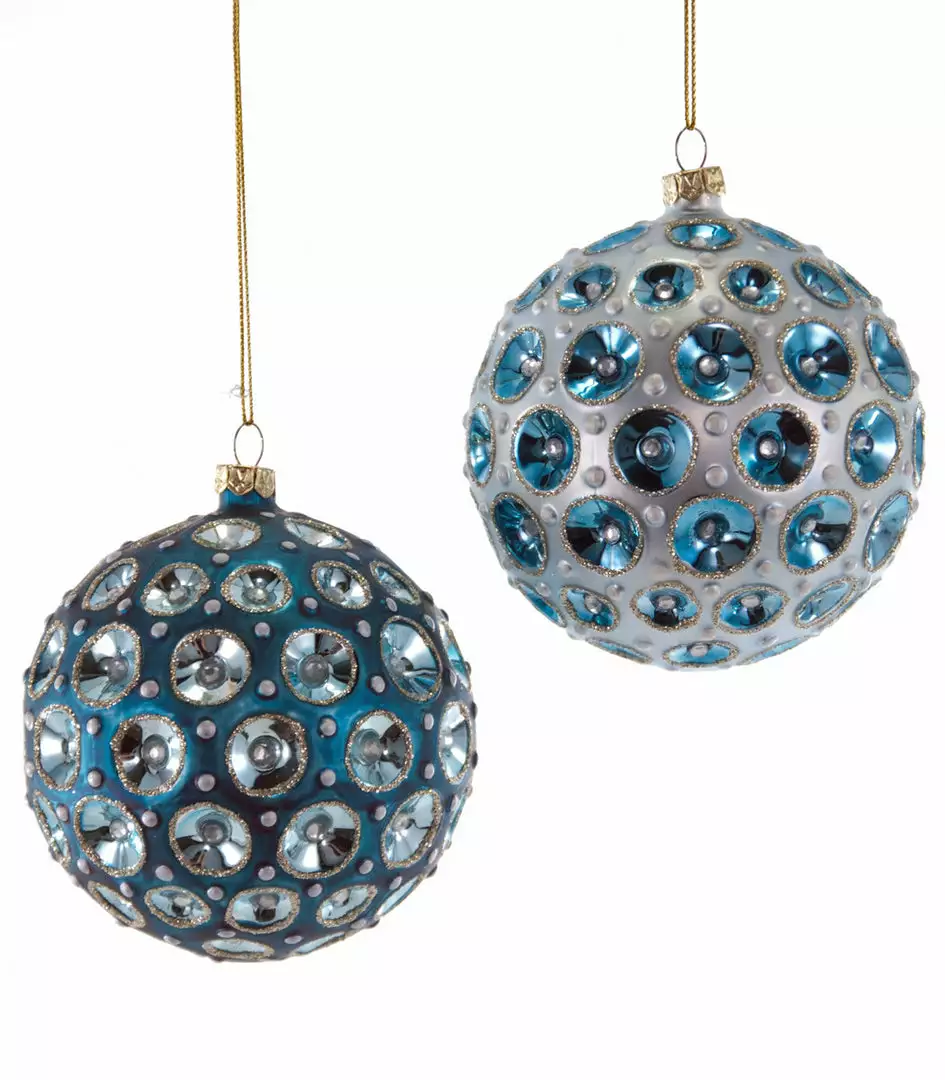 Unique round sculpted ball ornaments in beautiful shades of blue.