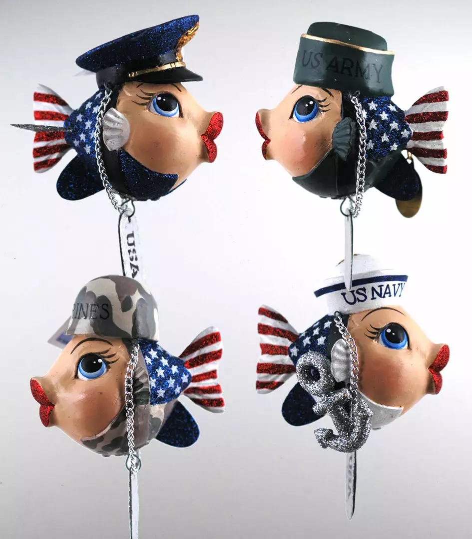 Show your support of the troops with these fun Military Kissing Fish Ornaments. Choose from Air Force, US Army, US Navy, and the Marines.