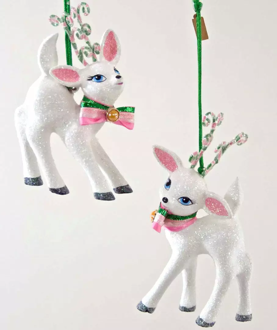 Bring back sweet memories with these two kitschy cute white reindeer ornaments embellished with pink and green bows.