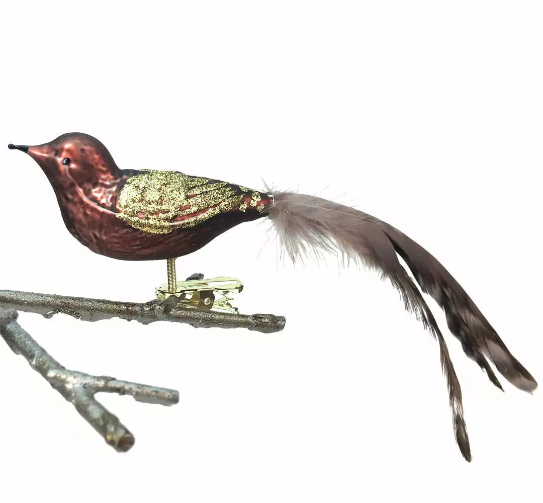 - Mouth-blown glass clip-on bird ornament with feathers.