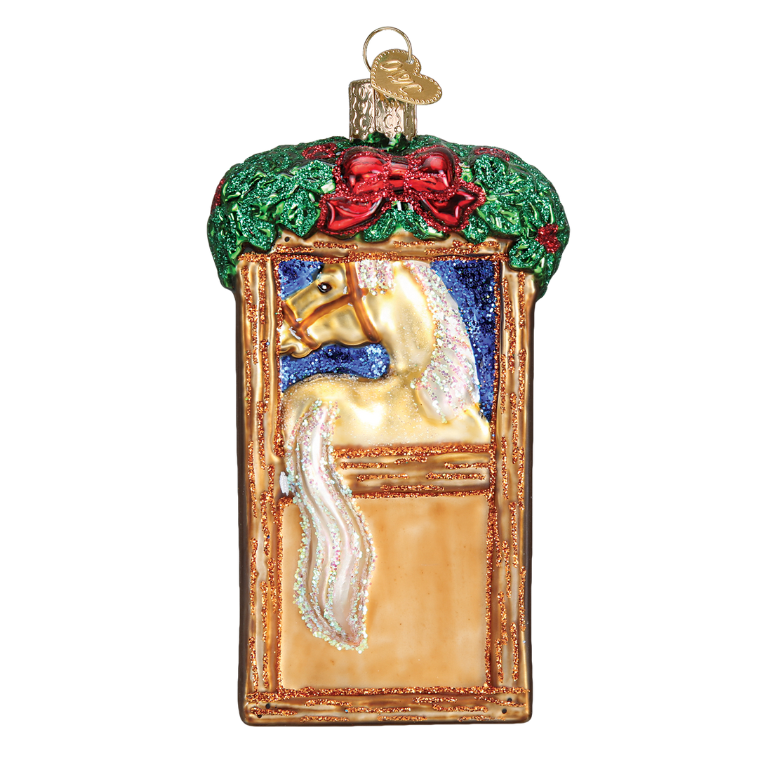 - 4.25″ x 2″ x 1.25″ Glass Horse in Stall Ornament
