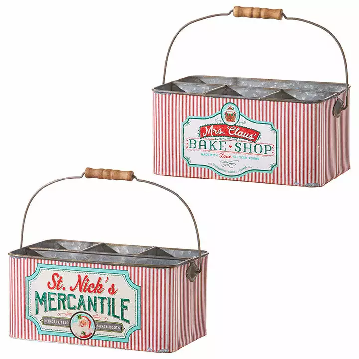 Add vintage charm to your holidays with the Mrs. Claus Bake Shop and St. Nick’s Merchanile Divided Buckets designed by Artist Lori Siebert!