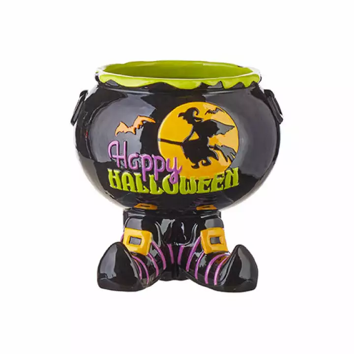 Witches fly in to wish you a happy Halloween. Brew up a wicked good with this colorful Candy Cauldron with witch Feet.