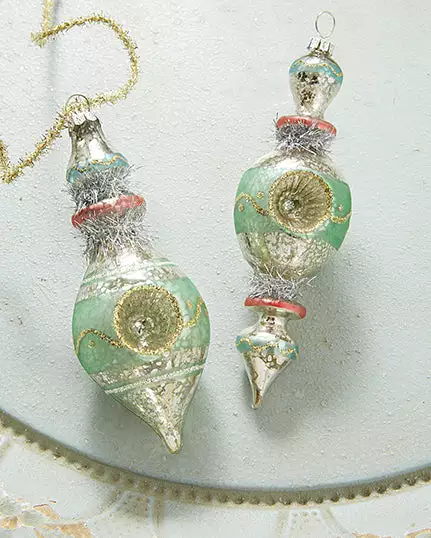 - Vintage-inspired mercury glass ornaments with tinsel and glitter accents