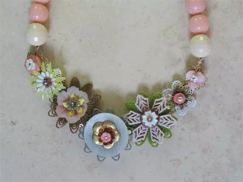 - Vintage beads and button combine with felt, filigree metal and plastic finds.