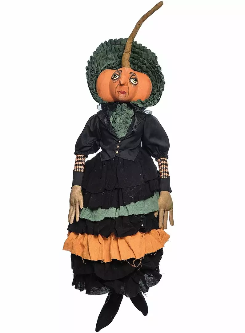 Greet the ghouls and goblins with this unique Halloween pumpkin lady.