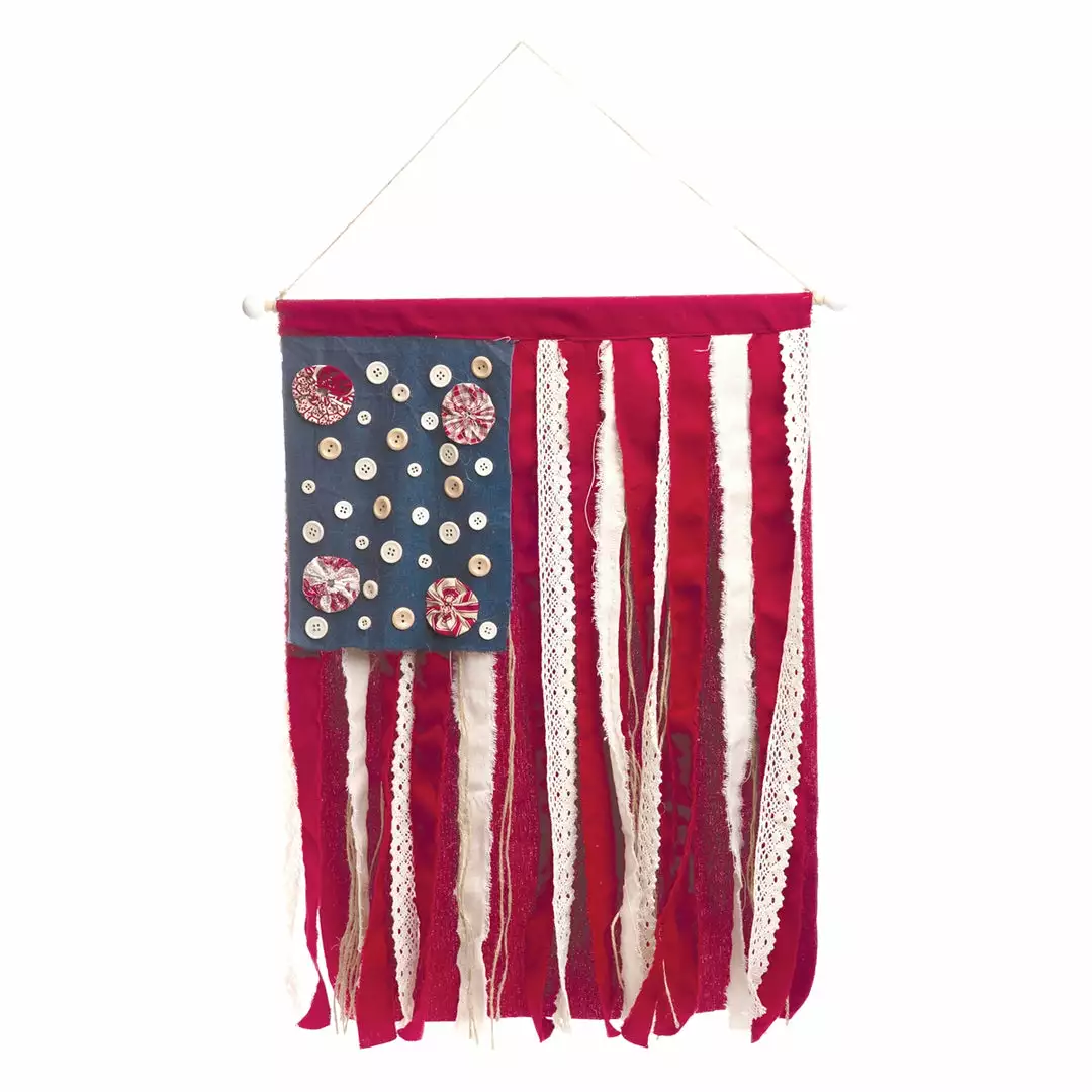 Buttons, rosettes, fabric and crochet style ribbon create an artful way to display your patriotism.